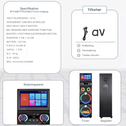 • Tilslutning: Bluetooth 5.0, Wi-Fi, USB, TF, AUX-IN, MIC-IN