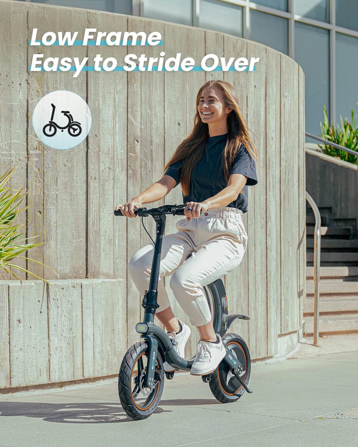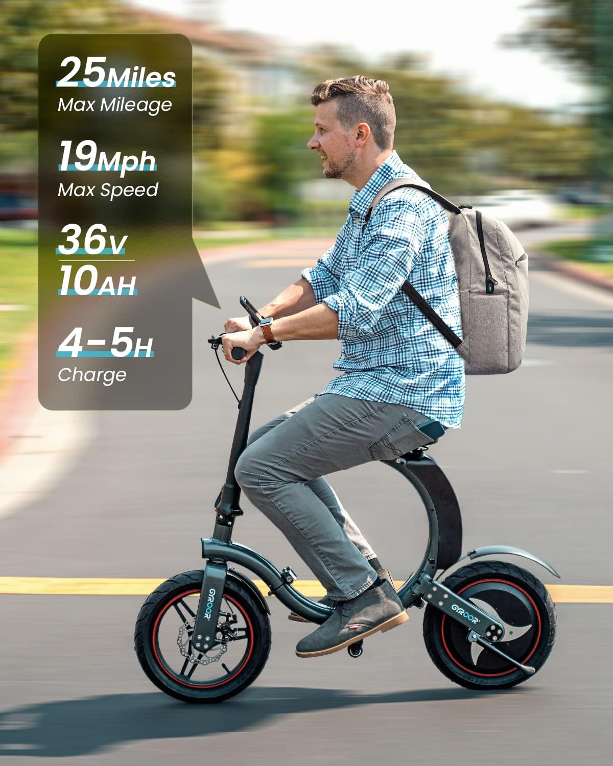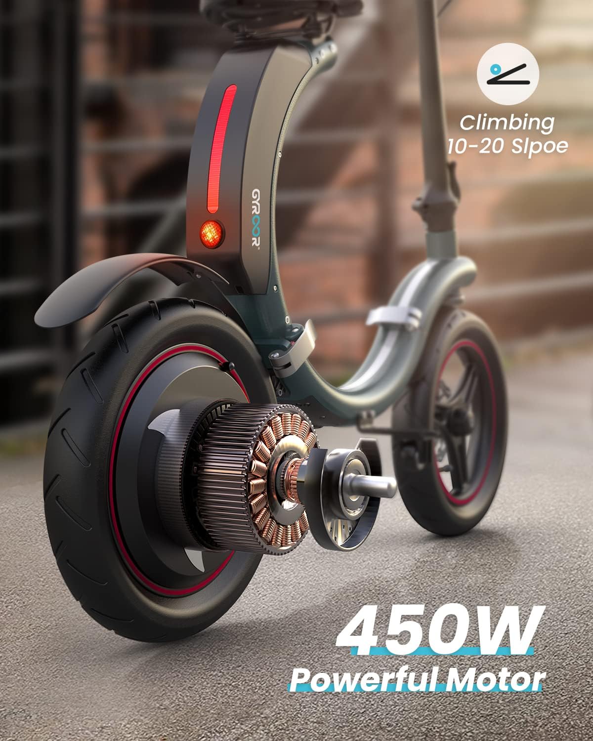 Discover the MetroFold™, a powerful folding electric bike designed for adults and teenagers. Equipped with a 450W brushless hub motor, it reaches a top speed of 18.6 mph and delivers a range of up to 25 miles on a single charge thanks to its 36V 10Ah battery. Ideal for fast and efficient urban commuting on flat roads.